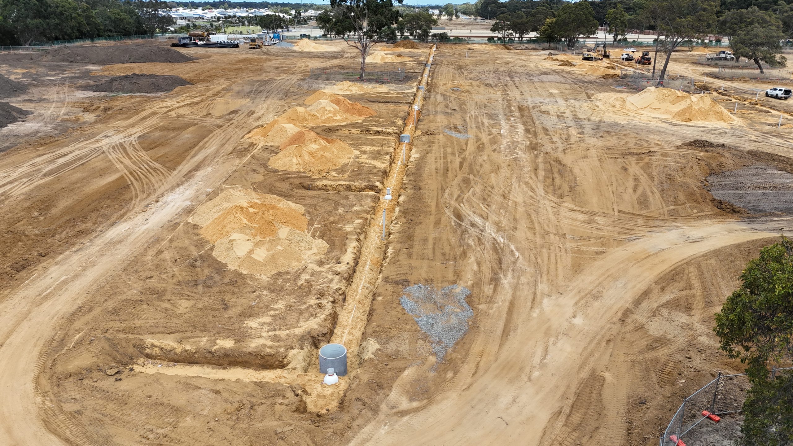 The images below show the first stage of trenching works – in this case, sewer trenching – which is approximately 90% complete.  Most of the accompanying pipework has been laid and portions of fill have been compacted into the completed areas.